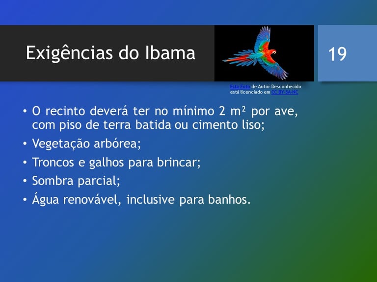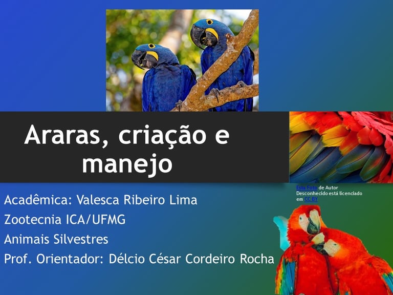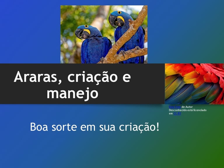 Portal AMBIENTEEMFOCO. LIMA, V. R. & ROCHA, Délcio. César. Cordeiro. Araras, Criação e Manejo . Série: Animais Silvestres. Artigo técnico nº 1 Publicado em 2022. Disponível em https://ambienteemfoco.com/araras-criacao-e-manejo Acesso em DIA/ MÊS/ ANO