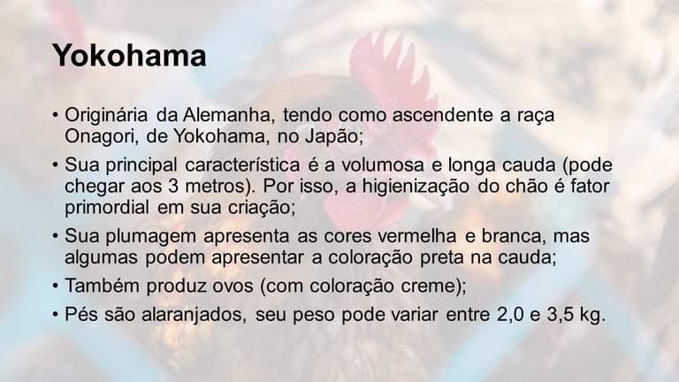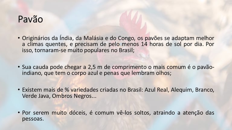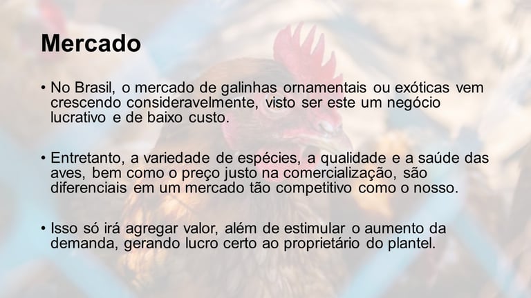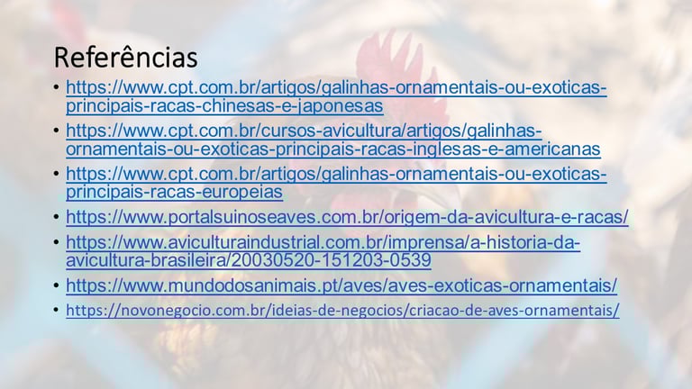 Portal AMBIENTEEMFOCO. REIS, J. Q.; MAIA, B. C. A.; FERES, J. C. de O. & ROCHA, D. C. C. Avicultura Ornamental, Principais Espécies, Raças e Curiosidades. Série: Desmistificando a Zootecnia/ Avicultura. Artigo técnico/Vídeo/Campanha nº 3. Publicado em 2022. Disponível em: https://ambienteemfoco.com/avicultura-ornamental-principais-especies-racas-e-curiosidades. Acesso em DIA/ MÊS/ ANO