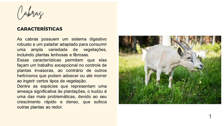 As cabras possuem um sistema digestivo robusto e um paladar adaptado para consumir uma ampla variedade de vegetações, incluindo plantas lenhosas e fibrosas. Essas características permitem que elas façam um trabalho excepcional no controle de plantas invasoras, ao contrário de outros herbívoros que podem adoecer ou até morrer ao ingerir certos tipos de vegetação. Dentre as espécies que representam uma ameaça significativa às plantações, o kudzu é uma das mais problemáticas, devido ao seu crescimento rápido e denso, que sufoca outras plantas ao redor. As cabras, no entanto, conseguem consumir o kudzu de maneira eficiente, ajudando a manter o equilíbrio ecológico das áreas afetadas.