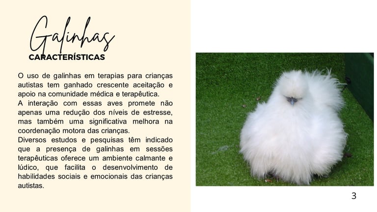 Em suma, a integração de galinhas em terapias para crianças autistas oferece um método eficaz e humano para promover o desenvolvimento emocional e motor. Essas terapias destacam a importância de um cuidado mútuo, onde tanto o bem-estar das crianças quanto das galinhas é respeitado e mantido em equilíbrio.