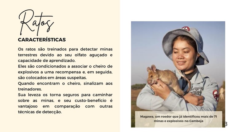 O treinamento especializado dos ratos farejadores envolve técnicas de condicionamento positivo, onde os animais são recompensados por indicar corretamente a presença da substância-alvo. No caso da detecção de minas terrestres, os ratos são ensinados a reconhecer o cheiro de explosivos como o TNT. Eles são levados a campos minados seguros, onde possuem uma taxa de sucesso impressionante em localizar minas, superando até mesmo os métodos tradicionais, como detectores de metais. A vantagem principal desses roedores é sua leveza, que permite a eles caminhar sobre terrenos minados sem detonar os explosivos.