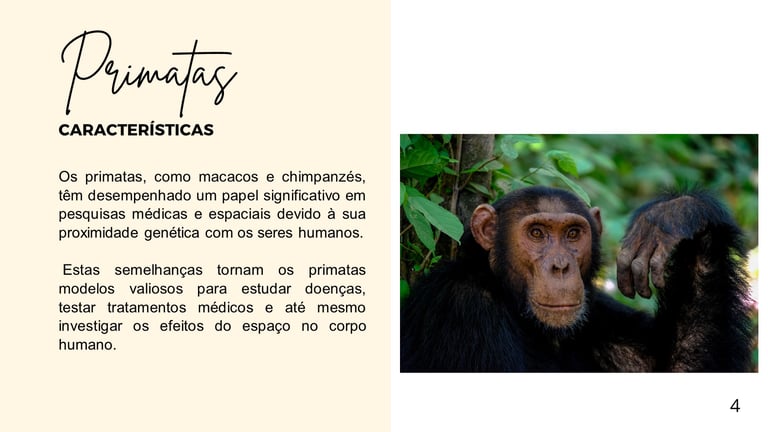 Os primatas, como macacos e chimpanzés, têm desempenhado um papel significativo em pesquisas médicas e espaciais devido à sua proximidade genética com os seres humanos. Estas semelhanças tornam os primatas modelos valiosos para estudar doenças, testar tratamentos médicos e até mesmo investigar os efeitos do espaço no corpo humano.