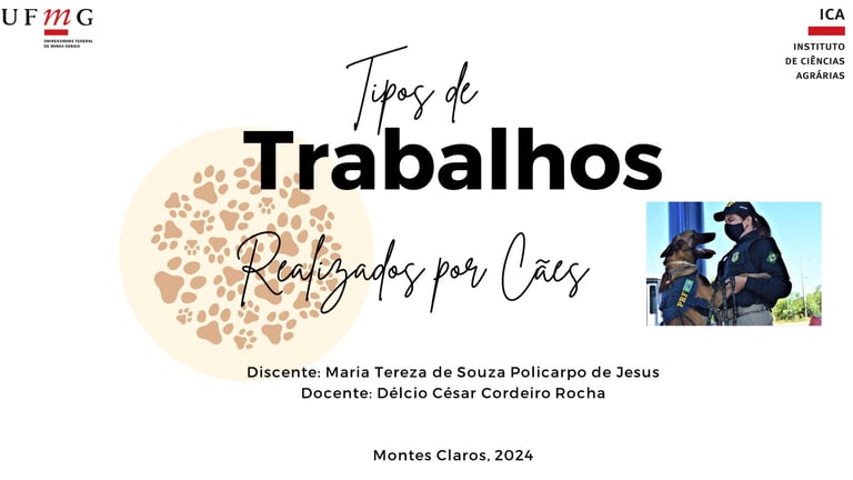 Conheça algumas raças de Cães utilizadas para trabalho no Brasil e no Mundo. Autora: Maria Tereza Policarpo de Jesus Série: Zootecnia/ Animais de trabalho/ Cães nº1 Prof. Orientador: Délcio César Cordeiro Rocha Disciplina: Criação e Exploração de Animais Domésticos Curso: Eng. Agrícola e Ambiental ICA/UFMG