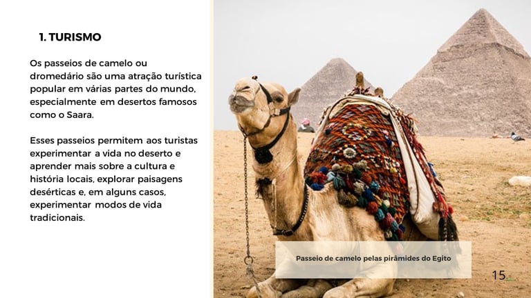 Além de suas funções utilitárias, camelos e dromedários também desempenham um papel crucial no turismo de várias regiões. As excursões guiadas, frequentemente organizadas em desertos, não só oferecem passeios panorâmicos, mas também uma imersão cultural em locais históricos e tradições locais. Eles proporcionam uma experiência autêntica e memorável para os turistas, o que, por sua vez, apoia o sustento das comunidades envolventes.