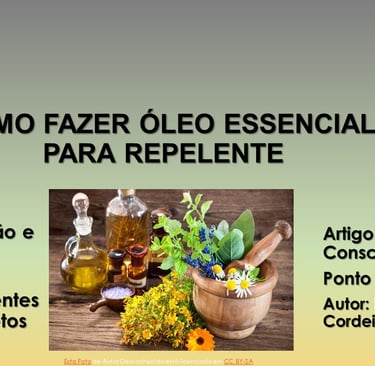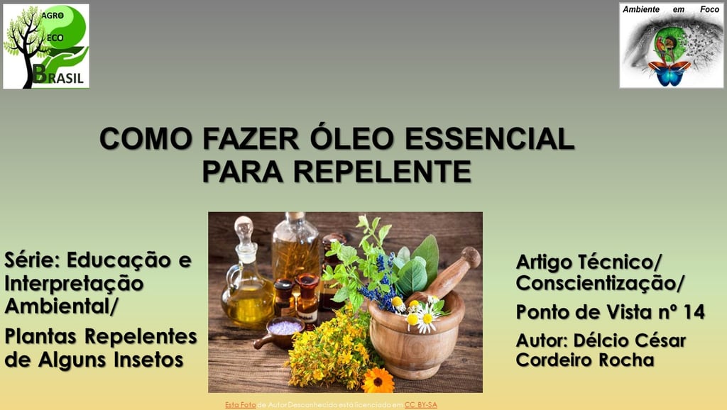 Portal AMBIENTEEMFOCO. ROCHA, D. C. C. Como Fazer Óleo Essencial para Repelente. Disponível em: https://ambienteemfoco.com/como-fazer-oleo-essencial-para-repelente. Série: Educação e Interpretação Ambiental/ Plantas Repelentes de alguns Insetos. Artigo técnico/Conscientização/Ponto de Vista nº 14. Publicado em 2023. Atualizado em 2024. Acesso em DIA/ MÊS/ ANO