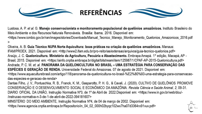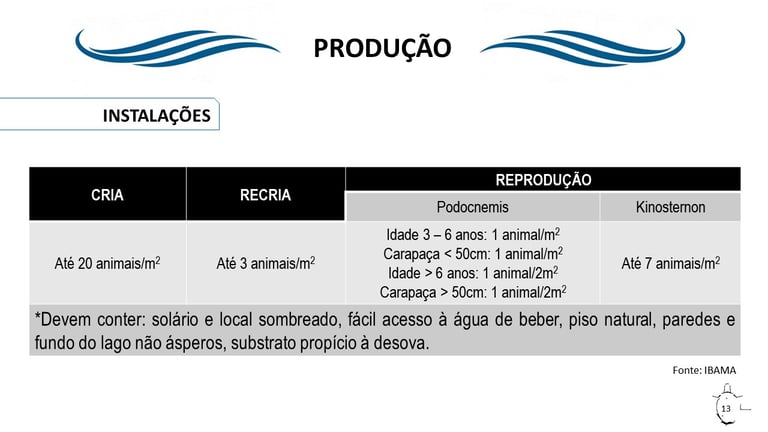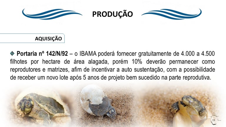 Portaria nº 142/N/92 – o IBAMA poderá fornecer gratuitamente de 4.000 a 4.500 filhotes por hectare de área alagada, porém 10% deverão permanecer como reprodutores e matrizes, afim de incentivar a auto sustentação, com a possibilidade de receber um novo lote após 5 anos de projeto bem sucedido na parte reprodutiva.