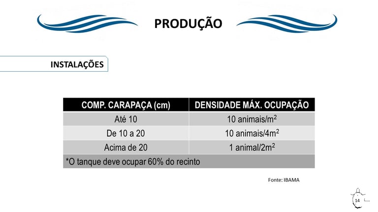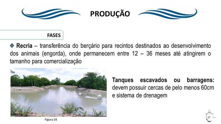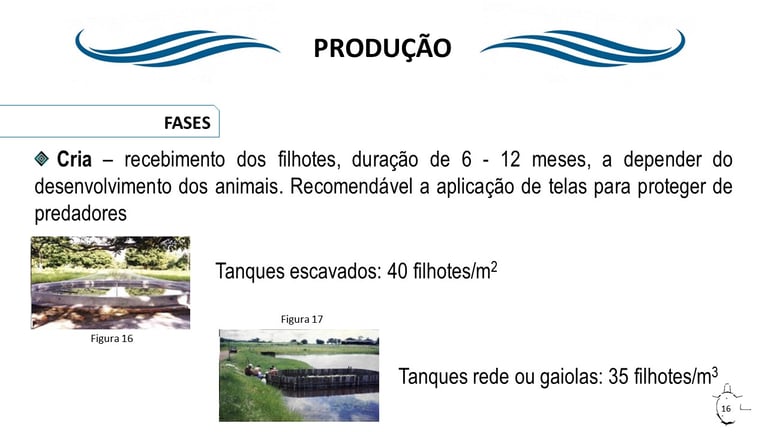 A) Cria – recebimento dos filhotes, duração de 6 - 12 meses, a depender do desenvolvimento dos animais. Recomendável a aplicação de telas para proteger de predadores, para tanques escavados são preconizados 40 filhotes/m² e em tanques redes 35 filhotes/m².