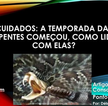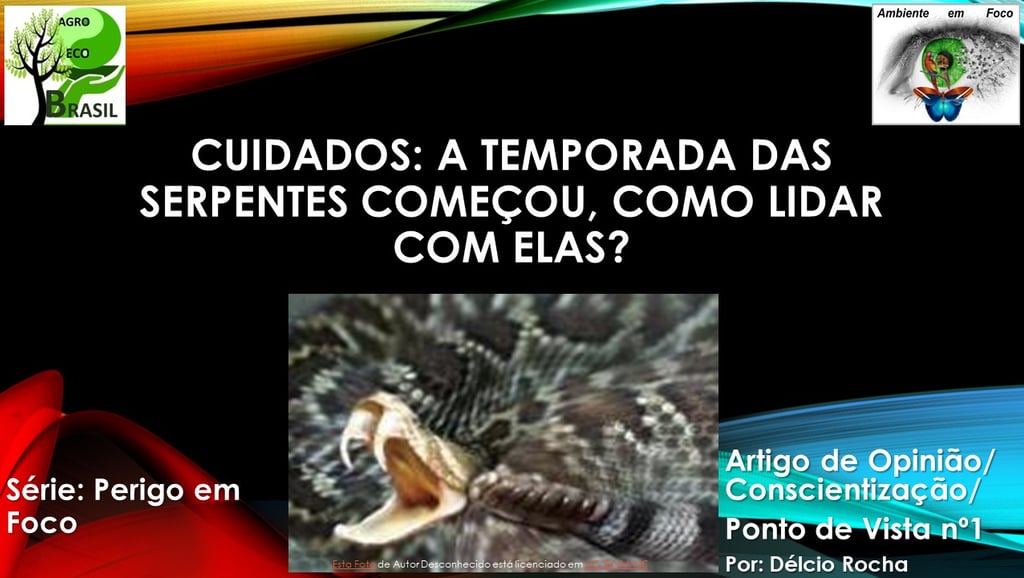 Portal AMBIENTEEMFOCO. ROCHA, D. C. C. Cuidado: Começou a Temporada de Serpentes, O que Fazer? Como Prevenir?. Disponível em: https://ambienteemfoco.com/cuidado-a-temporada-de-serpentes-comecou-o-que-fazer-como-prevenir. Série: Perigo em Foco. Artigo técnico/Conscientização/Ponto de Vista/ Opinião nº 1. Publicado em 2024. Acesso em DIA/ MÊS/ ANO