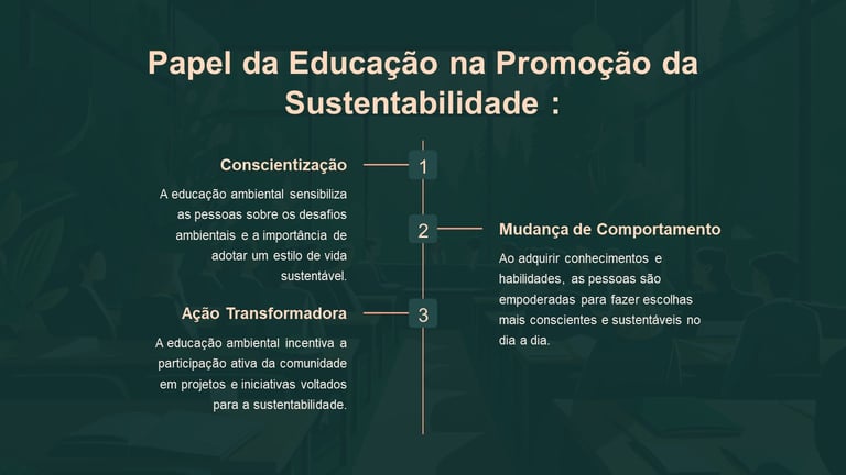A educação ambiental desempenha um papel crucial na promoção da sustentabilidade, capacitando indivíduos a fazer escolhas informadas e a adotar comportamentos que contribuem para a preservação do meio ambiente, ela é fundamental para transformar mentalidades e promover uma sociedade mais sustentável.