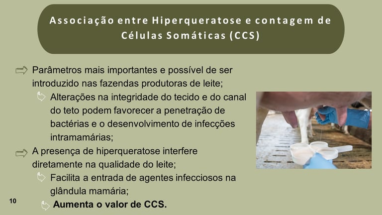 Um estudo conduzido por Estrela (2022), comparou a paridade, o DEL, o escore de hiperqueratose dos tetos e o valor da CCS individual mensal para avaliar a relação dos mesmos. O estudo envolveu 371 vacas em lactação, sendo essas mestiças Holandês X Girolando. Foi avaliada a condição das extremidades dos tetos de todas as vacas em lactação, após a ordenha, antes da aplicação da desinfecção dos tetos pós-ordenha. Como comprovado pelo estudo e também por outros autores (Fonseca et al.,2016; Neijenhuis, 2001; Mein et al., 2001) a hiperqueratose de teto aumenta o risco de mastite subclínica em vacas leiteiras. De acordo com Fonseca et al., 2016 tetos com hiperqueratose têm 8,3 vezes mais risco de terem mastite que tetos saudáveis. Além de não permitir o fechamento do esfíncter do teto, ela permite que os microrganismos se alojem no local, o que se torna reservatório para agentes causadores de mastite (Hillerton et al., 2001; Mein et al., 2003; Carneiro et al., 2009).