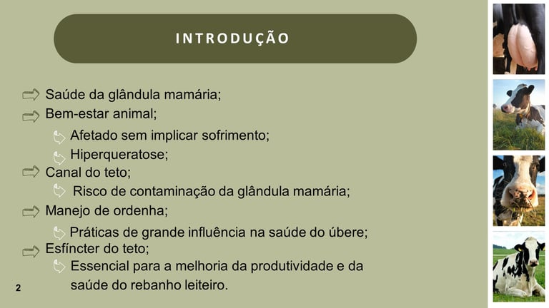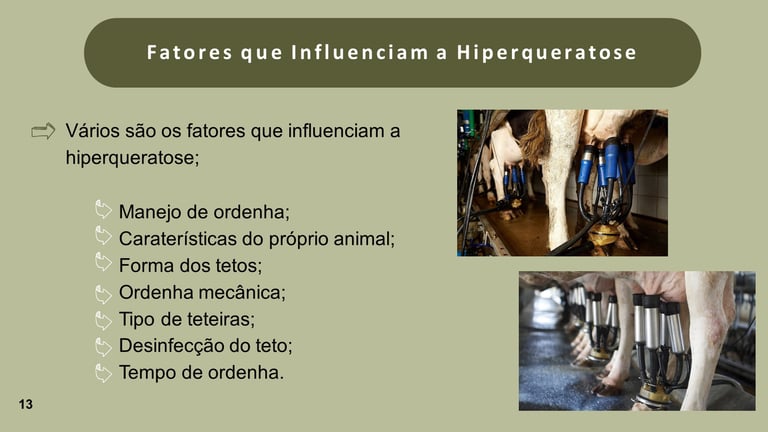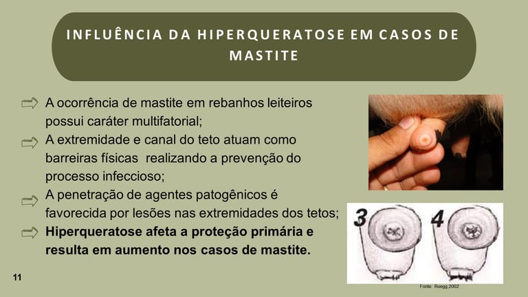 A ocorrência de mastite em rebanhos leiteiros possui caráter multifatorial (Prestes et al., 2002; Picoli et al., 2014). Entretanto, a extremidade e canal do teto atuam como barreiras físicas contra a entrada de micro-organismos na glândula mamária, prevenindo o processo infeccioso. A penetração de agentes patogênicos é favorecida por lesões nas extremidades dos tetos, como por exemplo, a hiperqueratose (Neijenhuis et al., 2000).