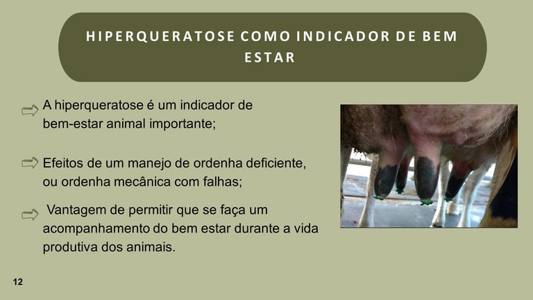 A hiperqueratose do canal dos tetos pode-se considerar como um indicador de bem-estar animal, face aos efeitos produzidos por um maneio de ordenha deficiente, ou ordenha mecânica com falhas (Sousa, 2008).