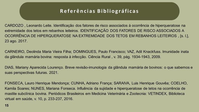 FONSECA, Lauro Henrique Mendonça; CUNHA, Adriano França; SARAIVA, Luis Henrique Gouvêa; COELHO, Kamila Soares; NUNES, Mariana Fonseca. Influência da sujidade e hiperqueratose de tetos na ocorrência de mastite subclínica bovina. Periódicos Brasileiros em Medicina Veterinária e Zootecnia: VETINDEX, Biblioteca virtual em saúde, v. 10, p. 233-237, 2016. Disponível em: https://www.bvs-vet.org.br/vetindex/periodicos/acta-veterinaria-brasilica/10-(2016)-3/influencia-da-sujidade-e-hiperqueratose-de-tetos-na-ocorrencia-de-mast/. Acesso em: 23 maio 2023.