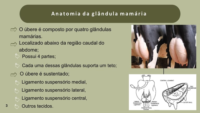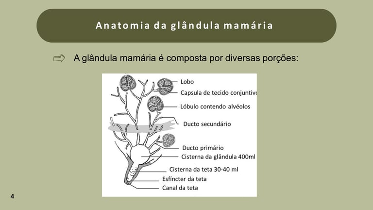 A glândula mamária é composta por diversas porções: lobo, são lóbulos agrupados em unidades maiores, a cápsula de tecido conjuntivo, lóbulo contendo alvéolos, ducto secundário, ducto principal, cisterna da glândula, cisterna da teta, esfíncter da teta e canal da teta, sendo a ênfase desse estudo o esfíncter do teto.