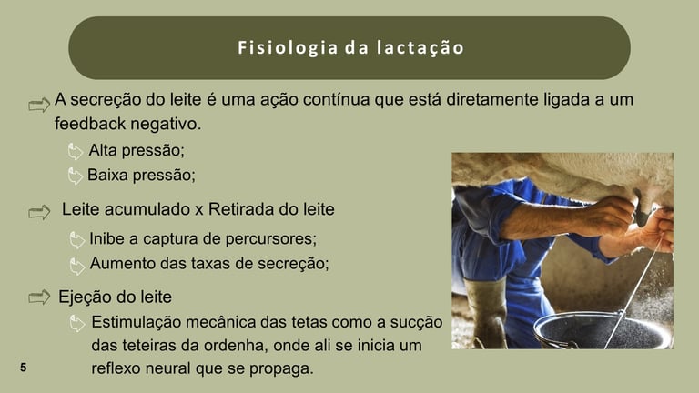 A secreção do leite é uma ação contínua que está diretamente ligada a um feedback negativo por consequência há uma alta pressão intra-alveolar, o que faz com que a capacidade de armazenagem de leite possa determinar a velocidade da secreção e produtividade da