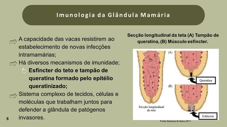 Há diversos mecanismos de imunidade da glândula mamária contra a entrada de microrganismos (CARNEIRO et al., 2009) sendo que, a primeira barreira física enfrentado pelo patógeno ao adentrar o úbere é formado pelo esfíncter do teto e pelo tampão de queratina formado pelo epitélio queratinizado (WILLIAMSON et al., 1995; BACHA e BACHA, 2000; JUNQUEIRA e CARNEIRO, 2004).