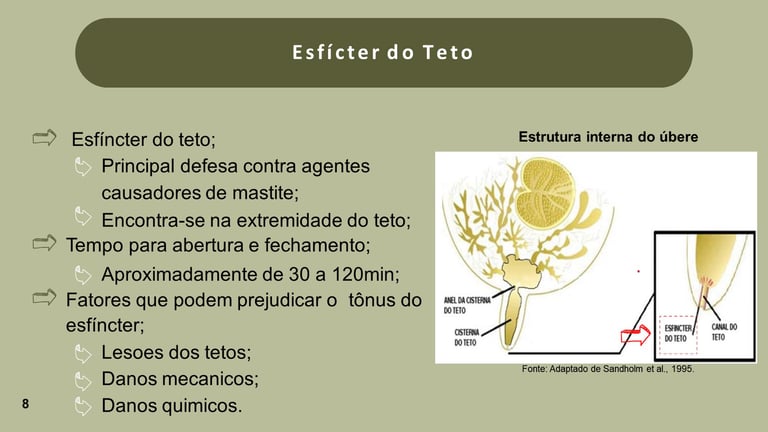 O esfíncter é a principal defesa contra a entrada de substâncias que causam mastite. PRESTES et al. (2002) enfatizaram que as principais barreiras físicas são o canal e o esfíncter do teto possuindo propriedades defensivas com um mecanismo de oclusão relativamente eficiente; a roseta de Furtenberg´s e ainda, as proteínas bactericidas. Além disso, os mesmos autores estudaram que o esfíncter do teto se mantém fechado entre as ordenhas, porém, após a ordenha, o canal do teto torna-se dilatado e permanece assim por, aproximadamente, 30 a 120 minutos, sendo necessário alimentar o animal nesse período, pois, ao ficar em pé, o esfíncter se fechará em menos de duas horas. Adicionalmente, ARAÚJO e GHELLER (2005) ao pesquisarem aspectos.