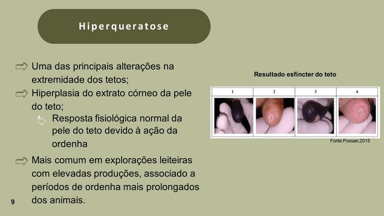 A hiperqueratose é uma das principais alterações na extremidade dos tetos, a qual se trata de uma hiperplasia do extrato córneo da pele do teto, podendo ocorrer devido a uma resposta fisiológica normal da pele do teto devido à ação da ordenha (MEIN et al., 2001; BREEN et al., 2009).