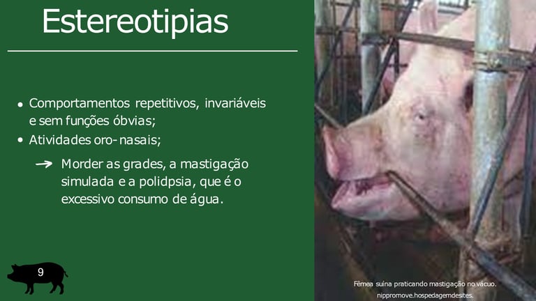 Morder grades, por exemplo, é um comportamento observado quando os suínos tentam lidar com a frustração decorrente da falta de estímulos ambientais ou da impossibilidade de realizar comportamentos naturais, como a exploração do solo. Semelhantemente, a mastigação simulada surge como uma resposta à restrição alimentar ou à ausência de material para manipulação e mastigação. Já a polidipsia é frequentemente detectada em situações de estresse crônico ou de fornecimento inadequado de nutrientes e água.