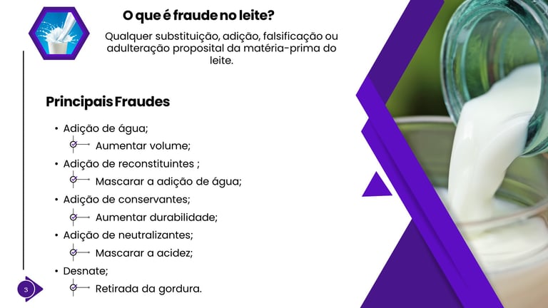 O leite é um dos alimentos mais consumidos globalmente e, por essa razão, está sujeito a fraudes que podem ocorrer em diversas etapas da sua cadeia produtiva. Essas fraudes podem comprometer a qualidade do produto, afetar a saúde dos consumidores e causar prejuízos econômicos tanto para os consumidores quanto para os produtores e indústrias.