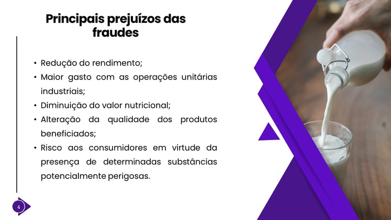 As fraudes no leite têm vários impactos negativos, como a redução do rendimento, uma vez que a adição de água ou outros reconstituintes pode diminuir o valor nutricional do leite. Além disso, há prejuízos econômicos, pois, além de afetar a qualidade do produto, a fraude pode gerar custos adicionais com operações industriais e controle de qualidade. Por fim, há riscos à saúde, pois a presença de substâncias potencialmente perigosas devido a práticas fraudulentas pode comprometer a saúde dos consumidores.
