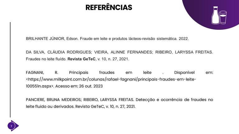 DA SILVA, CLÁUDIA RODRIGUES; VIEIRA, ALINNE FERNANDES; RIBEIRO, LARYSSA FREITAS. Fraudes no leite fluído. Revista GeTeC, v. 10, n. 27, 2021.