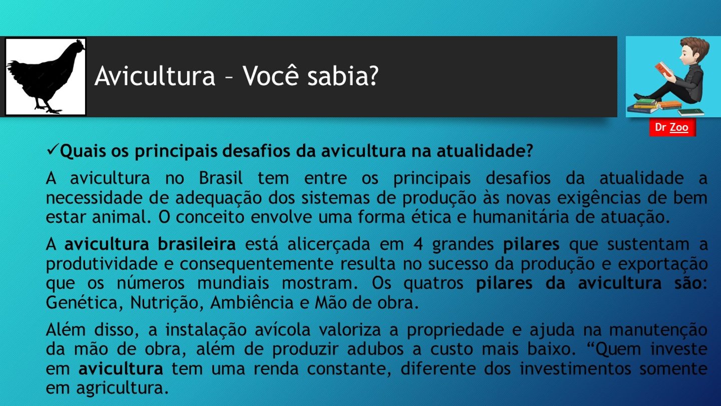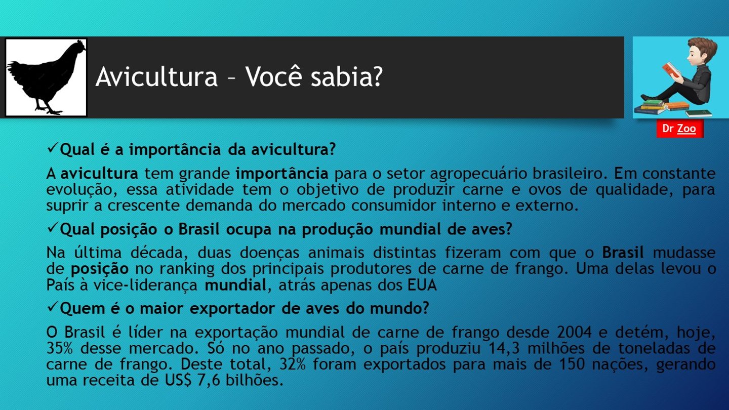 A Avicultura é uma prática de criação e cuidado de galinhas, com o objetivo de produzir ovos ( avicultura de postura) e carne (avicultura de corte).
