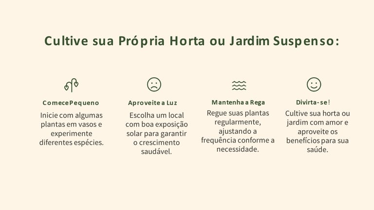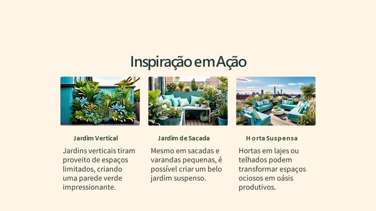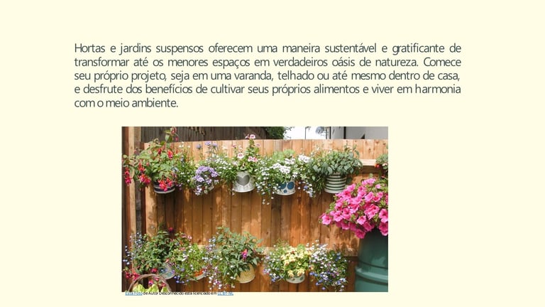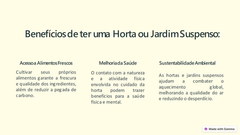 Destacar os benefícios das hortas e jardins suspensos, fornecer orientações sobre o planejamento e a execução desses projetos, e oferecer recomendações sobre os cuidados necessários para manter esses espaços produtivos e sustentáveis.