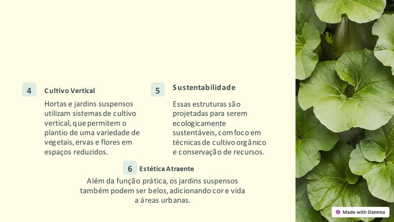 Hortas e jardins suspensos são uma excelente forma de integrar espaços verdes na vida urbana, trazendo benefícios significativos tanto para o meio ambiente quanto para a qualidade de vida das pessoas, oferecem uma maneira sustentável e gratificante de transformar até os menores espaços em verdadeiros oásis de natureza.