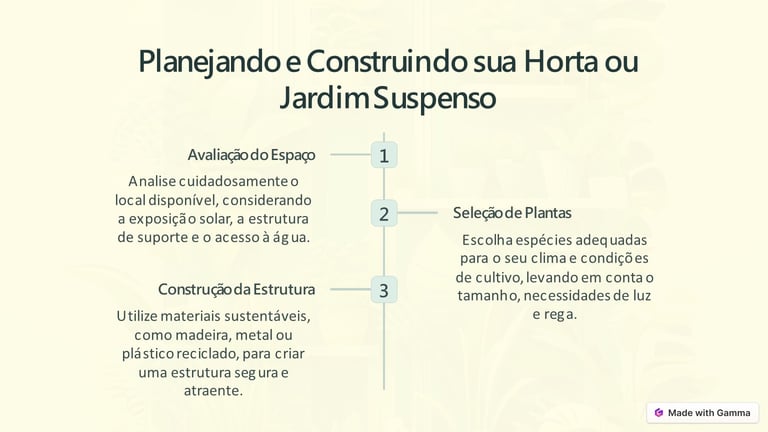 O planejamento de hortas e jardins suspensos começa com a escolha do local apropriado, que deve levar em consideração a exposição solar, a proteção contra ventos fortes e a acessibilidade.