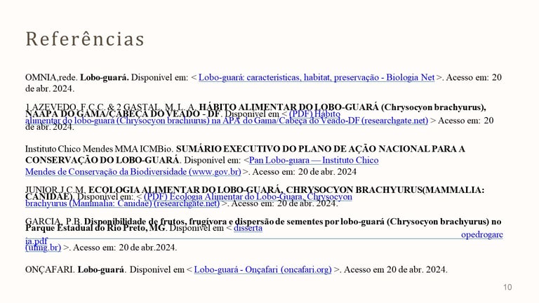 JUNIOR,J.C.M. ECOLOGIA ALIMENTAR DO LOBO-GUARÁ, CHRYSOCYON BRACHYURUS(MAMMALIA: CANIDAE). Disponível em: < (PDF) Ecologia Alimentar do Lobo-Guara, Chrysocyon
