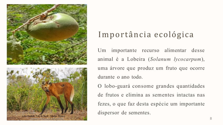 Adicionalmente, o lobo-guará possui uma afinidade notável por frutos selvagens. Um dos mais importantes é a lobeira (Solanum lycocarpum), planta nativa do cerrado brasileiro. Este fruto desempenha um papel crucial não apenas como uma fonte de alimento, mas também no ciclo reprodutivo e na manutenção da saúde do lobo-guará, ajudando a regular seu sistema digestivo e a proteger contra parasitas.