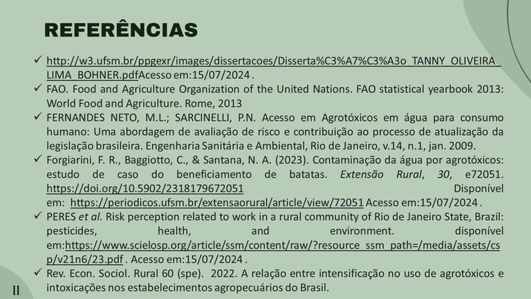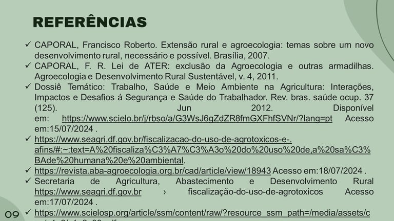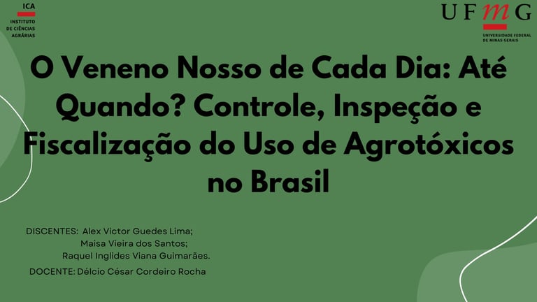 Portal AMBIENTE EM FOCO. LIMA, A. V. G.; SANTOS, M. V. dos.; GUIMARÃES, R. I. V. & ROCHA, D. C. C. O Veneno Nosso de Cada Dia, Até Quando? Controle, Inspeção e Fiscalização do Uso de Agrotóxicos no Brasil . Disponível em: https://ambienteemfoco.com/o-veneno-nosso-de-cada-dia-ate-quando-controle-inspecao-e-fiscalizacao-do-uso-de-agrotoxicos-no-brasil Série: Eco Cidadão do Planeta. Campanha/Artigo técnico nº1. publicado em 2024 Acesso em DIA/ MÊS/ ANO