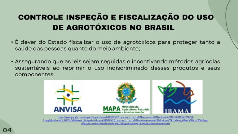 No Brasil, o uso de agrotóxicos representa uma questão de significante relevância tanto para a saúde pública quanto para o meio ambiente. Este artigo tem como objetivo aprofundar a compreensão sobre a importância do controle, inspeção e fiscalização dessas substâncias, destacando o papel essencial do Estado neste contexto. O uso desmedido de agrotóxicos pode levar a severas consequências, tais como intoxicações agudas e crônicas em seres humanos, contaminação de recursos hídricos e degradação do solo e da biodiversidade.