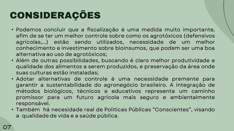 Dessa forma, a proteção da saúde pública e do meio ambiente depende de um esforço conjunto, onde políticas públicas eficazes, fiscalização abrangente e participação ativa da sociedade são elementos essenciais para se alcançar um uso responsável e racional dos agrotóxicos na agricultura brasileira.