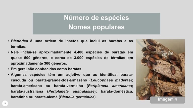 Portal AMBIENTE EM FOCO. SÁ, L. V. S.; SANTOS, B. G.; BRITO, A. do S. C. de.; & ROCHA, D. C. C. Ordem Blatodea: Habitat, Ciclo de Vida e Importância Biológica. Disponível em: https://ambienteemfoco.com/ordem-blatodea-habitat-ciclo-de-vida-e-importancia-biologica. Projetos: Aprendendo com as Plantas e Animais na Min Fazenda/ Eco Cidadão do Planeta. Série: Insetos. Ponto de Vista/Artigo técnico nº2. publicado em 2024. Acesso em DIA/ MÊS/ ANO