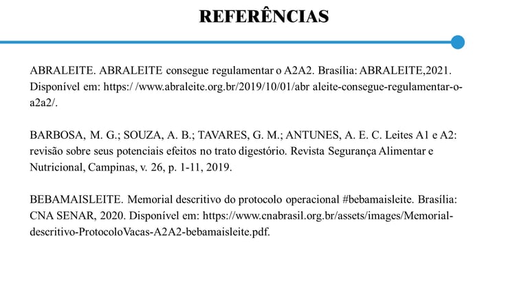 ABRALEITE. ABRALEITE consegue regulamentar o A2A2. Brasília: ABRALEITE,2021. Disponível em: https:/ /www.abraleite.org.br/2019/10/01/abr aleite-consegue-regulamentar-o-a2a2/.