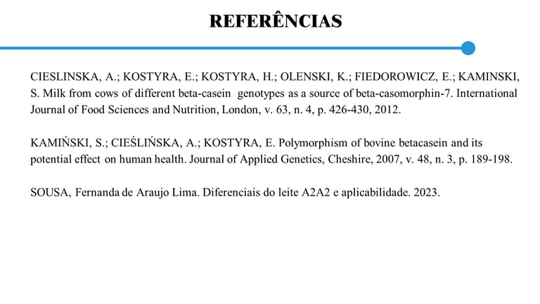 BARBOSA, M. G.; SOUZA, A. B.; TAVARES, G. M.; ANTUNES, A. E. C. Leites A1 e A2: revisão sobre seus potenciais efeitos no trato digestório. Revista Segurança Alimentar e Nutricional, Campinas, v. 26, p. 1-11, 2019.
