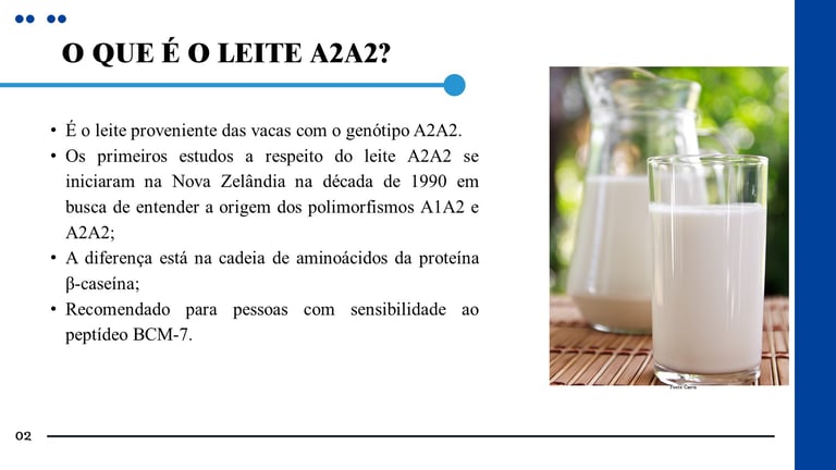 Os primeiros estudos a respeito do leite A2A2 se iniciaram na Nova Zelândia na década de 1990 em busca de entender a origem dos polimorfismos A1A2 e A2A2 (BARBOSA et al., 2019). Os resultados evidenciaram que a diferença está na cadeia de aminoácidos da proteína β-caseína, mais precisamente na posição p.67.