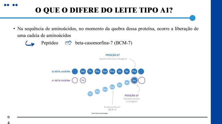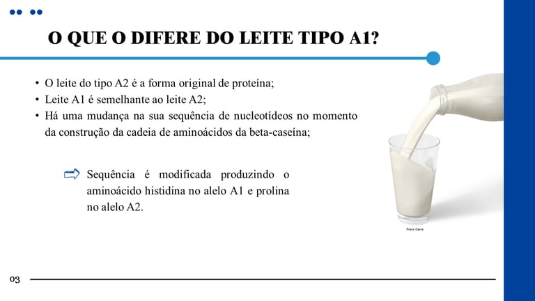 Entretanto, é importante destacar que o leite A1 é semelhante ao leite A2 em termos nutricionais, ou seja, considerando proteínas, gorduras, vitaminas, carboidratos e minerais, apresentando diferença apenas na posição do aminoácido.