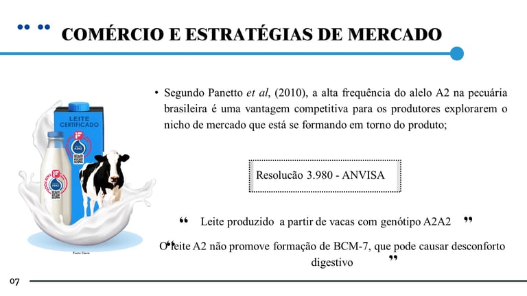 O Brasil, que já é destaque no quesito produção de leite, tem um significativo potencial para investir em seleção genética e estabelecer seus rebanhos já existentes como rebanhos homozigotos focados na produção de leite A2A2, 13 produto que possui tendência de valorização. Cieslinska et al. (2012) defendem que os benefícios identificados nos estudos científicos sejam cada vez mais divulgados, especialmente para os indivíduos que já possuam alguma característica restritiva ao consumo do leite convencional (desconforto gastrointestinal, alergia à proteína do leite de vaca, entre outras).