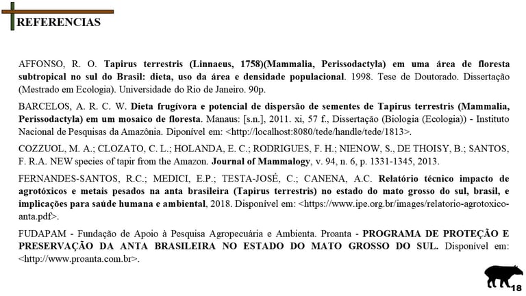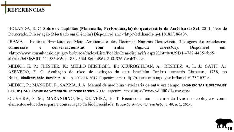 Portal AMBIENTEEMFOCO. GASPAR, Raphael Colombo. & ROCHA, Délcio César Cordeiro. Antas ou Tapir, Criação e Manejo. Série: Animais Silvestres. Artigo técnico nº 4 Publicado em 2022. Disponível em: https://ambienteemfoco.com/producao-e-criacao-de-anta-ou-tapir. Acesso em DIA/ MÊS/ ANO