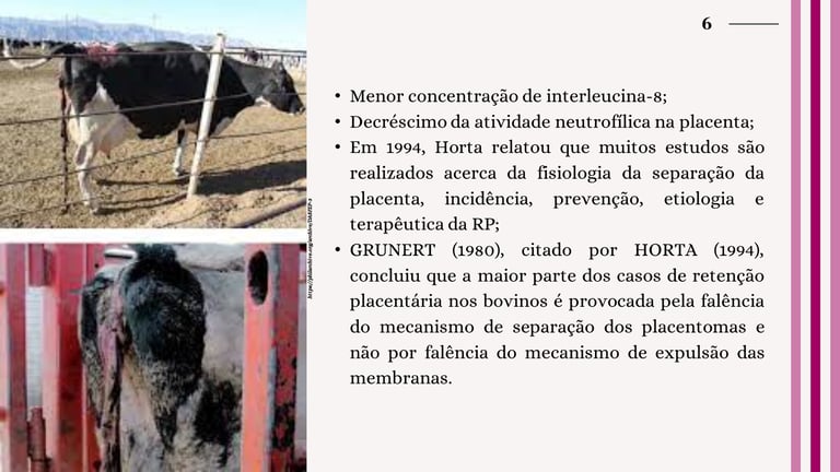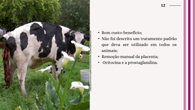 Vacas pluríparas, que já tiveram várias parições, são particularmente suscetíveis à retenção placentária, exigindo uma atenção especial durante o manejo reprodutivo (HORTA, 1994). No tratamento da retenção placentária, a remoção manual da placenta e a administração de medicamentos como ocitocina e prostaglandina são comuns, embora não exista um tratamento padrão universalmente aceito.