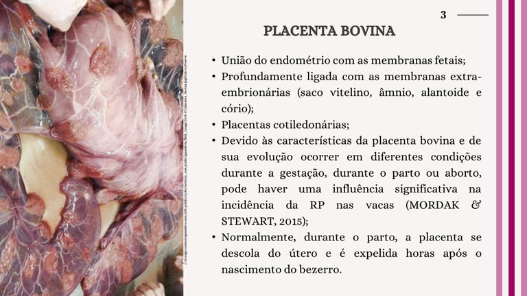 A placenta bovina é um órgão crucial para a gestação, constituindo a interface entre o feto e a mãe. Ela se desenvolve a partir da união do endométrio uterino com as membranas fetais e extra-embrionárias, como o saco vitelino, âmnio, alantoide e cório. Em bovinos, a placenta possui uma estrutura cotiledonária, o que implica uma ligação complexa e altamente especializada. Contudo, devido à sua evolução e função durante a gestação, parto e abortos, a retenção de placenta (RP) emerge como um problema significativo.