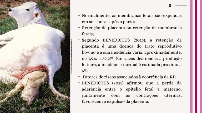 A retenção pode ocorrer em 1,9% a 39,2% dos casos, com uma incidência média de cerca de 5% em vacas leiteiras (BENEDICTUS, 2015). A falha na separação da placenta é frequentemente atribuída a uma inadequada adesão entre o epitélio fetal e materno, aliada a contrações uterinas insuficientes (BENEDICTUS, 2015; GRUNERT, 1980). Este problema pode ser exacerbado por uma menor concentração de interleucina8 e uma diminuição na atividade neutrofílica da placenta (MORDAK & STEWART, 2015).