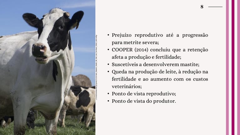 Os impactos da retenção placentária são substanciais. A condição pode levar a metrite severa, afetar negativamente a produção de leite e a fertilidade das vacas, e aumentar os custos veterinários (COOPER, 2014). Além disso, vacas com RP estão mais suscetíveis a desenvolver mastite e apresentam uma queda na produção de leite.