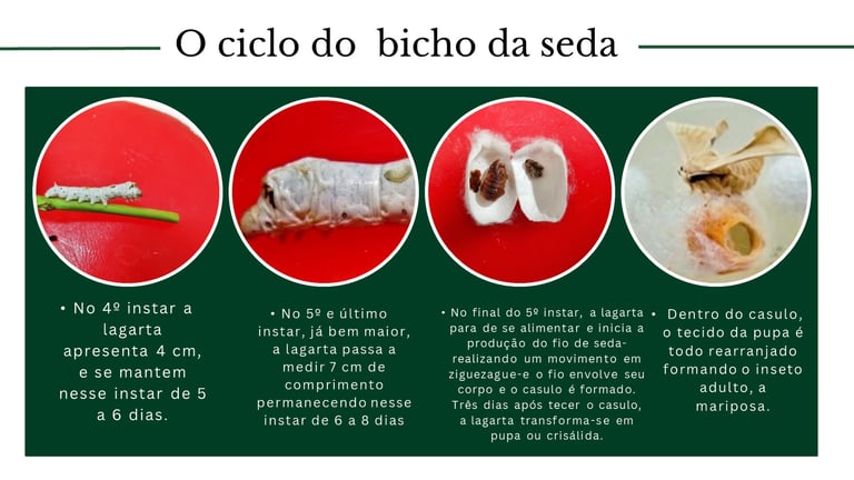 · Ao atingir o 5º e último instar, a lagarta passa a medir 7 cm de comprimento, permanecendo nesse instar de 6 a 8 dias. No final do 5º instar, a lagarta para de se alimentar e inicia a produção do fio de seda. Ela realiza um movimento em ziguezague, o fio envolve seu corpo e o casulo é formado. Três dias após tecer o casulo, a lagarta transforma-se em pupa ou crisálida.