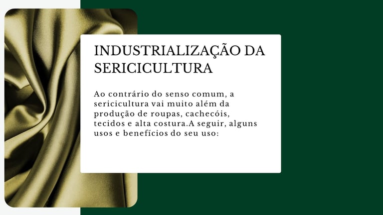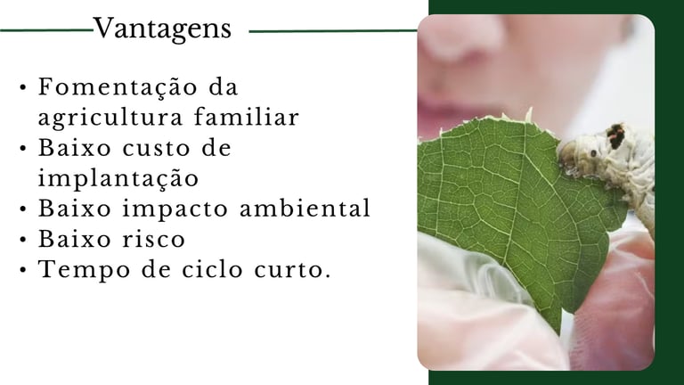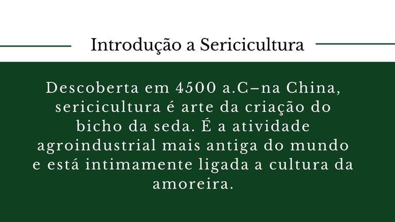 Descoberta em 4500 ac–na China–,sericicultura é arte da criação do bicho da seda. É a atividade agroindustrial mais antiga do mundo e está intimamente ligada a cultura da amoreira, cultivo livre de agrotóxicos e a indústria têxtil.
