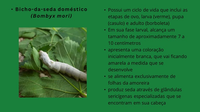 · Possui um ciclo de vida que inclui as etapas de ovo, larva (verme), pupa (casulo) e adulto (borboleta)