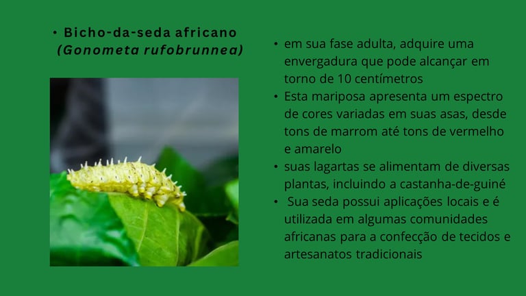O Anaphe silkmoth é nativo da África do Sul. Produz casulos de seda de cor verde-amarelada com um brilho iridescente. A seda africana é leve, macia e possui propriedades antimicrobianas. Sua produção ainda é em escala menor, mas vem crescendo devido à sua beleza e propriedades únicas.